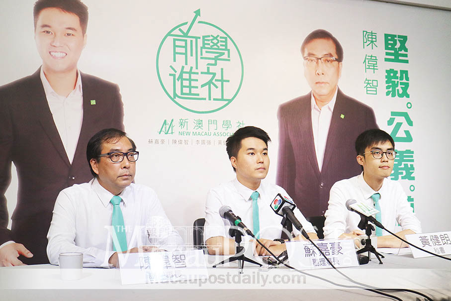 Board members of the New Macau Association (NMA) held a press conference yesterday at the grassroots group’s office in Nam Van to express their opposition to certain amendments to the Legislative Assembly Procedure Rules proposed by the legislature’s Committee on House Rules, such as barring lawmakers from displaying placards during plenary sessions.