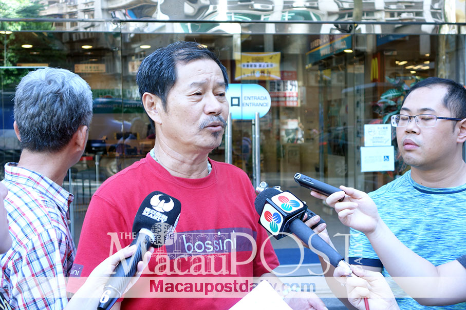 Activist Lam Meng (centre), standing in front of fellow activist Kuong Kai Nang (left) speaks to reporters yesterday after handing in a petition addressed to the committee’s President Tong Hio Fong outside the Public Administration Building in Rua do Campo. Photo: Annie Cheung