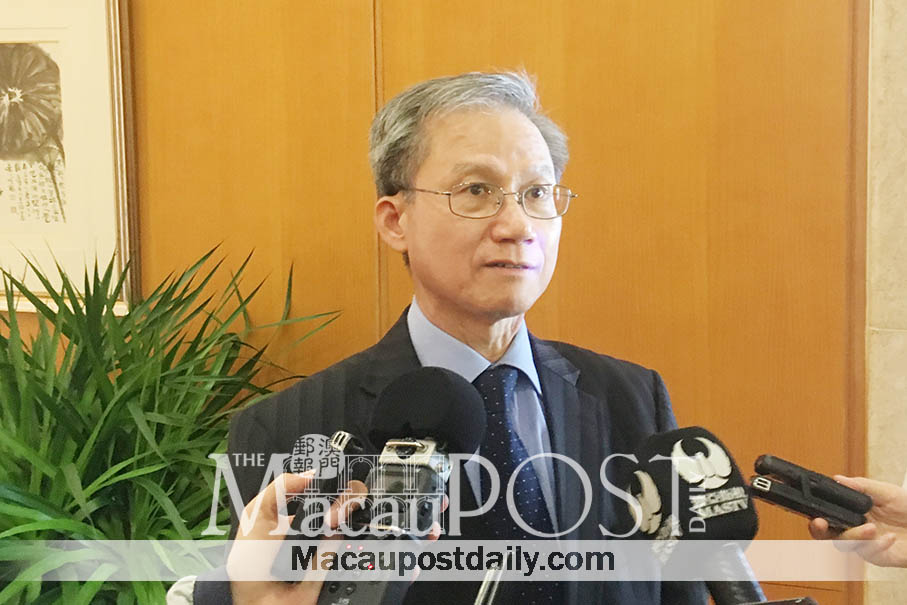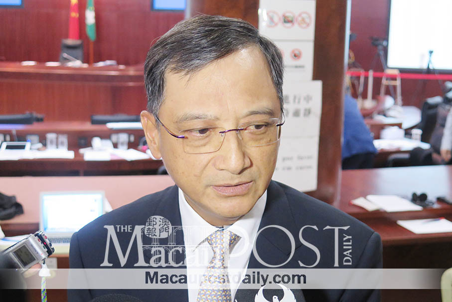 Committee on House Rules President Vong Hin Fai speaks to reporters before yesterday’s plenary session at the building of the Legislative Assembly (AL). Photo: Debby Seng