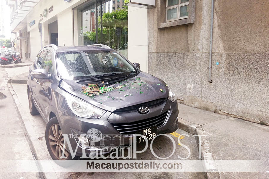 Broken glass is scattered on the bonnet of a car outside Chong Fong Industrial Building in Avenida do Dr. Francisco Vieira Machado yesterday after a box of beer fell from the building. Photo: Iong Tat Choi