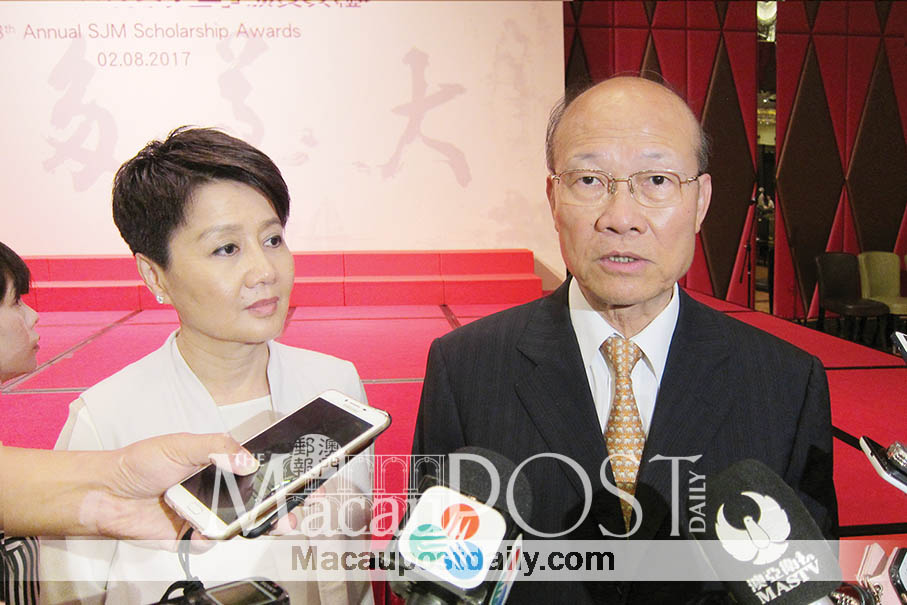 SJM Chairman of the Board of Directors Ambrose So Shu Fai (right) and SJM Managing Director and Chief Administrative Officer Angela Leong On Kei meet the press after hosting the 13th Annual SJM Scholarship Awards at Grand Lisboa yesterday. Photo: Monica Leong