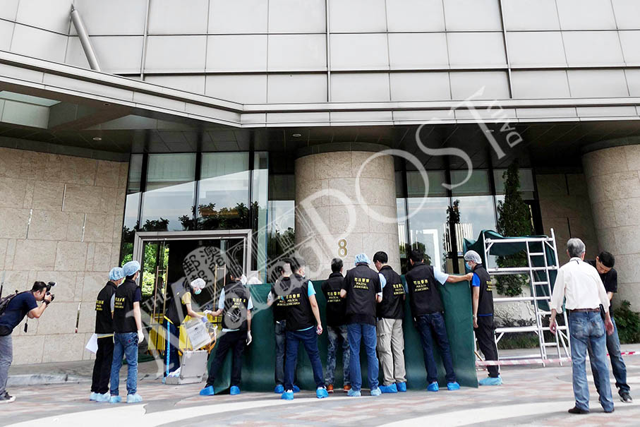 Judiciary Police (PJ) officers investigate the suspected homicide-suicide case in One Oasis in Coloane yesterday. Photo: Iong Tat Choi