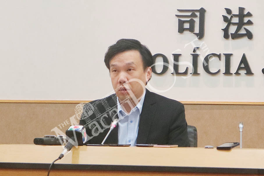 Judiciary Police (PJ) spokesman Tam Weng Keong addresses yesterday’s regular press conference in a PJ pressroom. Photo: Debby Seng