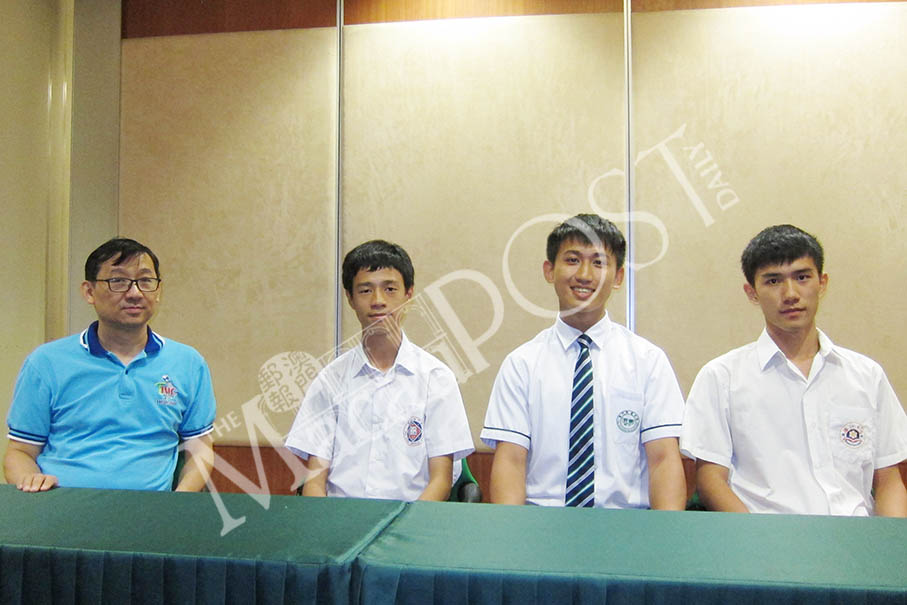 Three pupils Chau Hou Tin (second from left), Cheang Kai Un and Tam Hou pose with their IMO deputy team leader Leong Ieng Tak (left) during a meet-the-press session at the Education and Youth Affairs Bureau (DSEJ) on Wednesday. Photo: Monica Leong