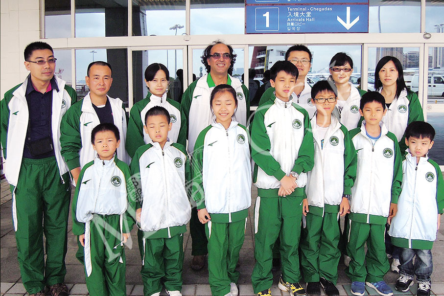 Outside Macau Ferry Terminal before leaving for Sri Lanka in 2012. Six-year old Ip Weng Tou (front far right) with the Macau Chess Team, Chinese Chess Master and teacher Xiong Junyang (third left at back) Jose Silveirinha President of Macau Chess Federation 2012 (centre back).