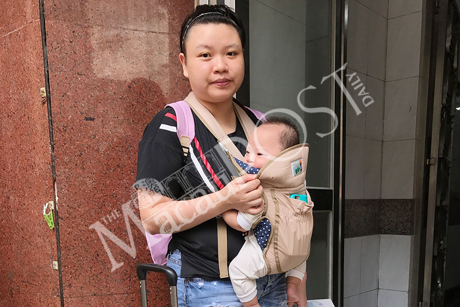 A local resident, surnamed Chan, carrying her baby, poses yesterday in Patane district before going to a friend’s flat in Taipa with functioning power and tap water supplies. Photos: Maria Cheang Ut Meng