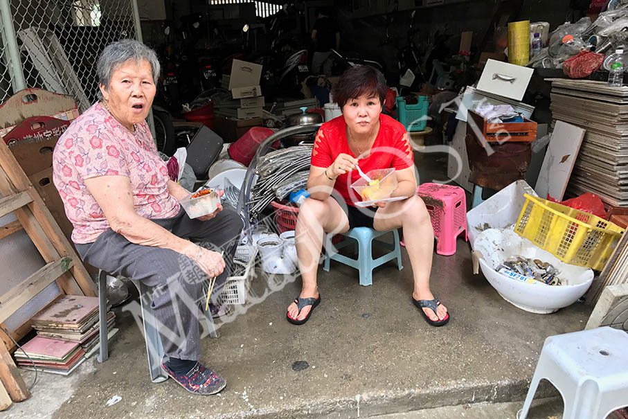 A construction material shop owner, surnamed Kou (right), and a family member have an expensive post-typhoon lunch box meal yesterday at the shop in Patane district.