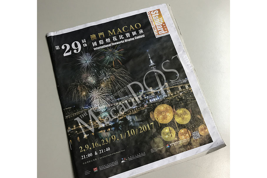 This photo taken yesterday shows the front- and back-page ad of the 29th Macau International Fireworks Display Contest in The Standard newspaper in Hong Kong on Friday.