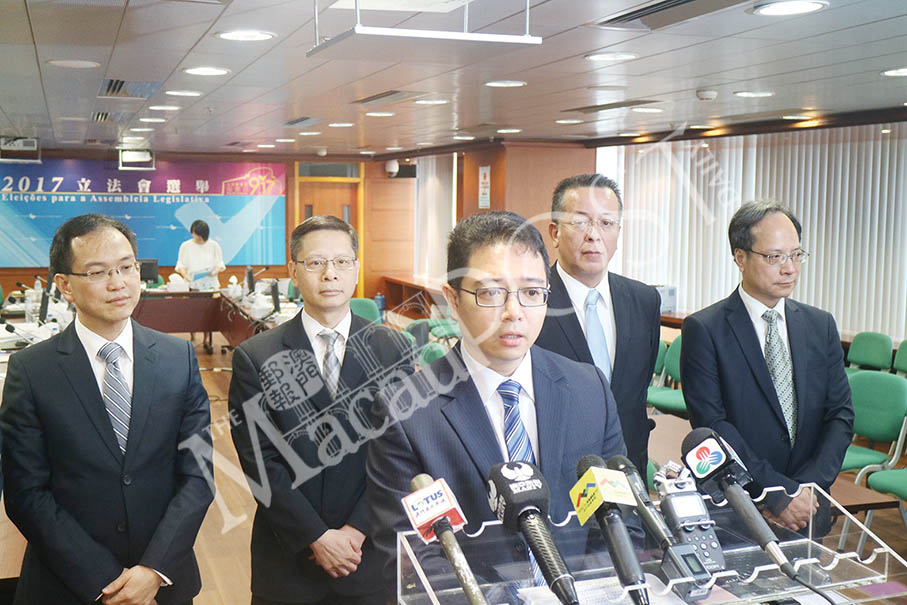 Legislative Assembly Electoral Affairs Committee (CAEAL) President Tong Hio Fong (front) speaks to reporters yesterday after a regular meeting of the government-appointed body, as fellow committee members Kou Peng Kuan (first from left), Lai U Hou (second from left), Jose Fonseca Tavares (second from right) and Iong Kong Leong (first from right) look on, at the Public Administration Building in Rua do Campo. Photo: Debby Seng