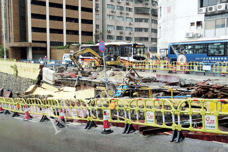 The seven-metre section was fenced off after the collapse at the junction of Rua dos Pescadores and Estrada de D. Maria II (known as Melco bend during the Macau Grand Prix).