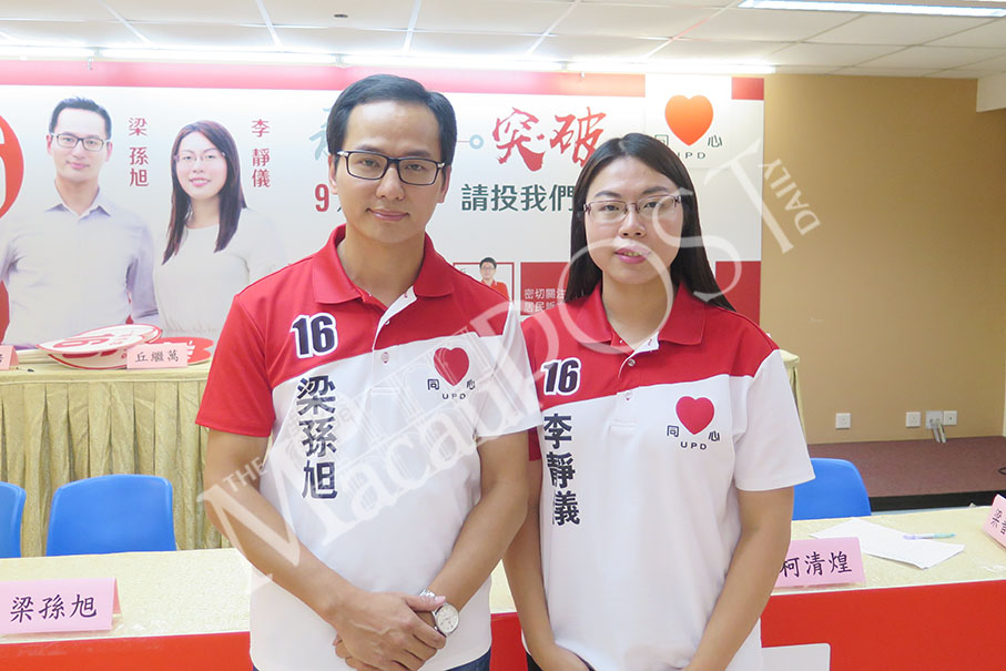 The first-ranked candidate of the Union for Development (UPD), Ella Lei Cheng I (right), and the second-ranked candidate, Leong Sun Iok, pose on the sidelines of yesterday’s press conference to announce details of their group’s political platform, at an activity centre run by the Macau Federation of Trade Unions in Iao Hon district. Photo: Tony Wong