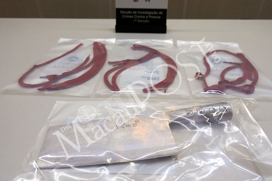 The cleaver and shoelaces that the suspect allegedly used when attacking her husband are displayed in a pressroom of the Judiciary Police (PJ) headquarters yesterday. Photo: Iong Tat Choi