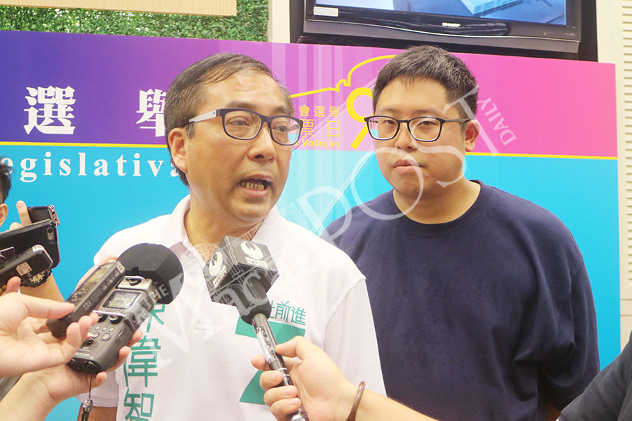 Paul Chan Wai Chi (left), the second-ranked candidate of the electoral group New Macau Progressives (ANPM), No. 7 on Sunday’s ballot, speaks to reporters, as Jason Chao Teng Hei, a volunteer of the New Macau Association (NMA), looks on, at the Public Administration Building in Rua do Campo. Photo: Debby Seng