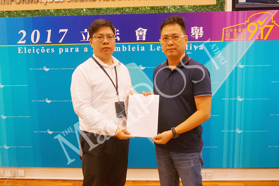 Chan Chon Pat (right), the official representative of the Macau Citizens Development Association (ACDM), No. 8 on Sunday’s ballot, hands a letter of complaint to an official at the Public Administration Building in Rua do Campo on Monday.