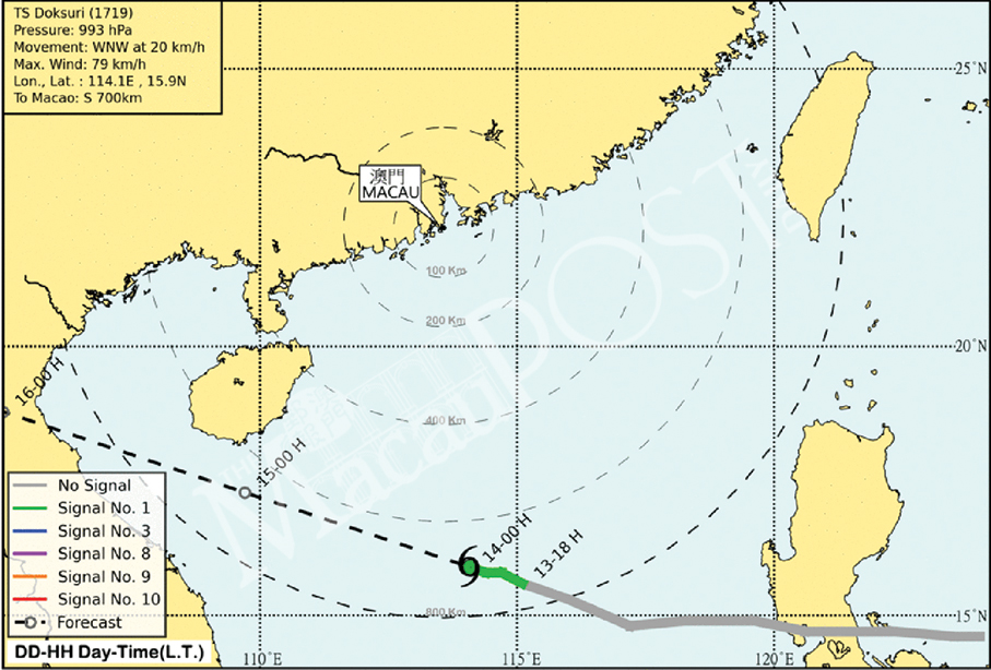 The bureau said yesterday that there was only a “low probability” that the No. 3 signal will be hoisted this morning.The bureau also said that Doksuri was forecast to pass about 600 kilometres away from Macau today.