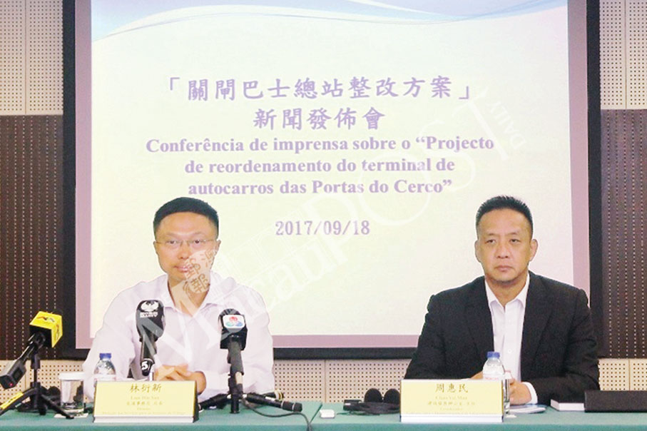 Transport Bureau (DSAT) Director Lam Hin San (left) and Infrastructure Development Office Director (GDI) Chau Vai Man address yesterday’s press conference about the Barrier Gate bus terminal repairs and improvement project, at the bureau. Photo: GCS