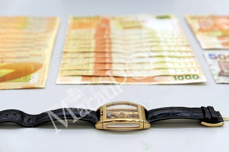This photo taken yesterday in a Judiciary Police (PJ) pressroom shows the victim’s luxury watch which the suspect had pawned and the cash seized from the suspect. Photo: Iong Tat Choi