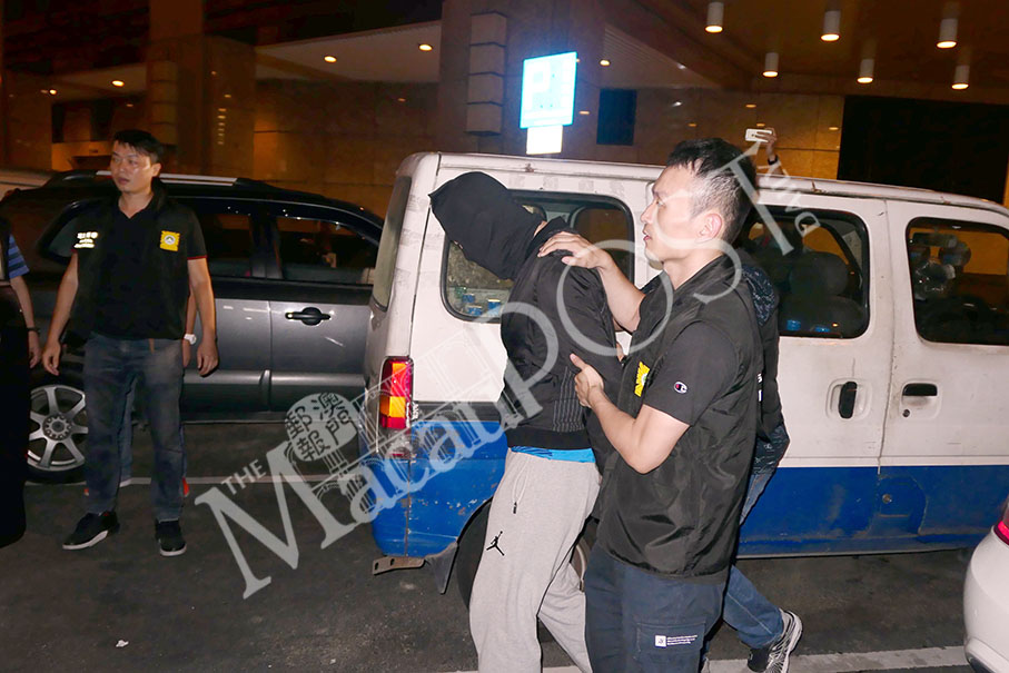 PJ officers escort the suspected drug trafficker (hooded) from his flat in La Residencia in Areia Preta last night. Photo: Iong Tat Choi