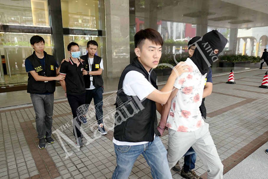 Judiciary Police (PJ) officers escort the two suspects (one hooded and the other masked) to a PJ vehicle outside the PJ headquarters in Zape yesterday. Photos: Iong Tat Choi