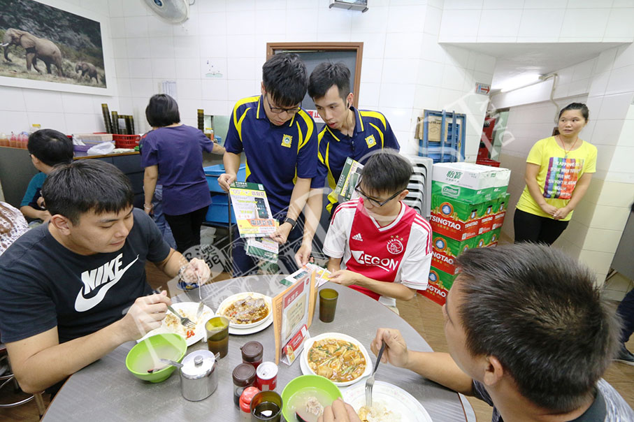 Judiciary Police (PJ) officers distribute anti-phone scam leaflets to young people in a restaurant near Avenida de Horta e Costa yesterday. Photo: PJ
