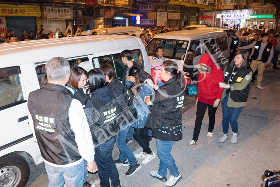 PJ officers escort seven “masseuses” to police vehicles after raiding “erotic” massage parlours in seven residential flats in Areia Preta district last night. Photo: Iong Tat Choi