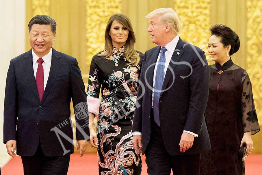US President Donald Trump (2nd from right) speaks to President Xi Jinping (left), as US First Lady Melania Trump (2nd from left) and Xi’s wife Peng Liyuan (right) look on, upon their arrival for a state banquet at the Great Hall of the People in Beijing yesterday evening. – AFP