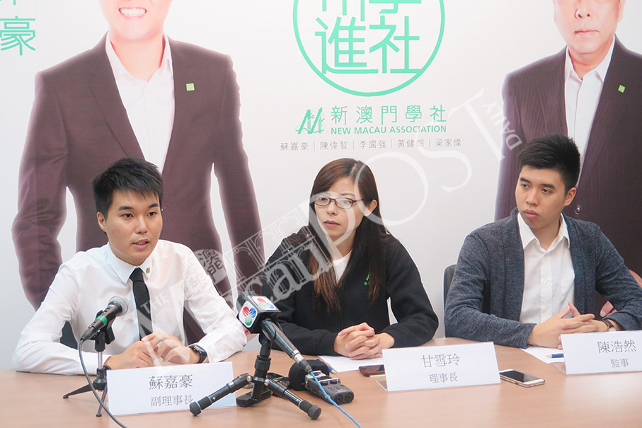 New Macau Association (NMA) Vice President Sulu Sou Ka Hou (left) speaks during yesterday’s press conference as the group’s president, Kam Sut Leng (centre), and a member of its supervisory board, Chan Hou In, look on, at the grassroots group’s office. Photo: Tony Wong