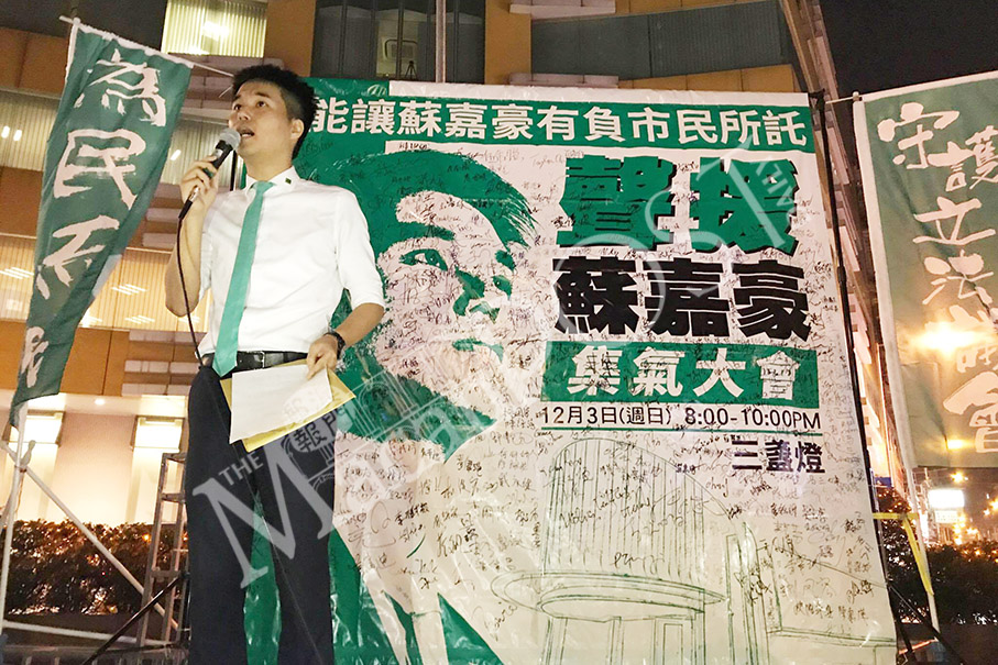 Troubled lawmaker Sulu Sou Ka Hou speaks to his supporters during a solidarity gathering about his possible suspension from the legislature, at Rotunda de Carlos da Maia last night. The slogans urge the public to support Sou so that he can keep election promises. Photo: Joel Chu