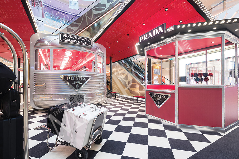 The installation mimicking locomotive railway stations in the US in the 1950s complete with a railway station ticket booth and a concierge at the shopping promenade at Galaxy Macau is Prada’s latest pop-up store.