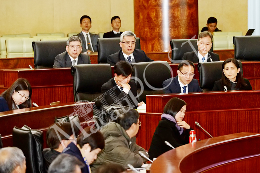 Secretary for Security Wong Sio Chak (centre, officials’ top row), flanked by Secretary for Transport and Public Works Raimundo do Rosario (left), Unitary Police Service (SPU) Commissioner-General Ma Io Kun, and other senior officials, attends yesterday’s plenary session in the legislature’s hemicycle. Photo: GCS