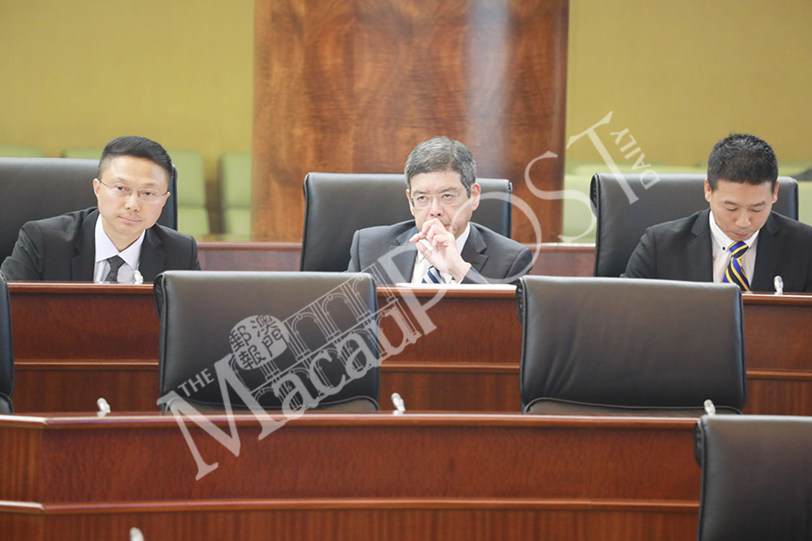 Secretary for Transport and Public Works Raimundo do Rosario (centre), Transport Bureau (DSAT) Director Kelvin Lam Hin San (left) and Lao Sio Hap, a senior officer of the Traffic Department of the Public Security Police (PSP), addresses yesterday’s plenary session in the legislature’s hemicycle. Photos: MPDG