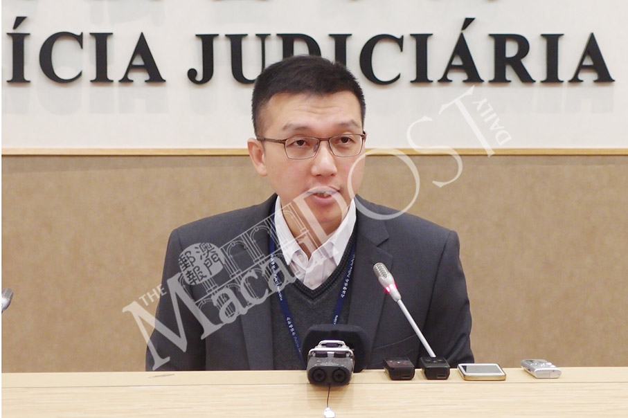 Judiciary Police (PJ) spokesman Choi Ian Fai reveals details of the city’s latest suspected crime cases during yesterday’s regular press conference at the PJ headquarters in Zape. Photo: Joel Chu