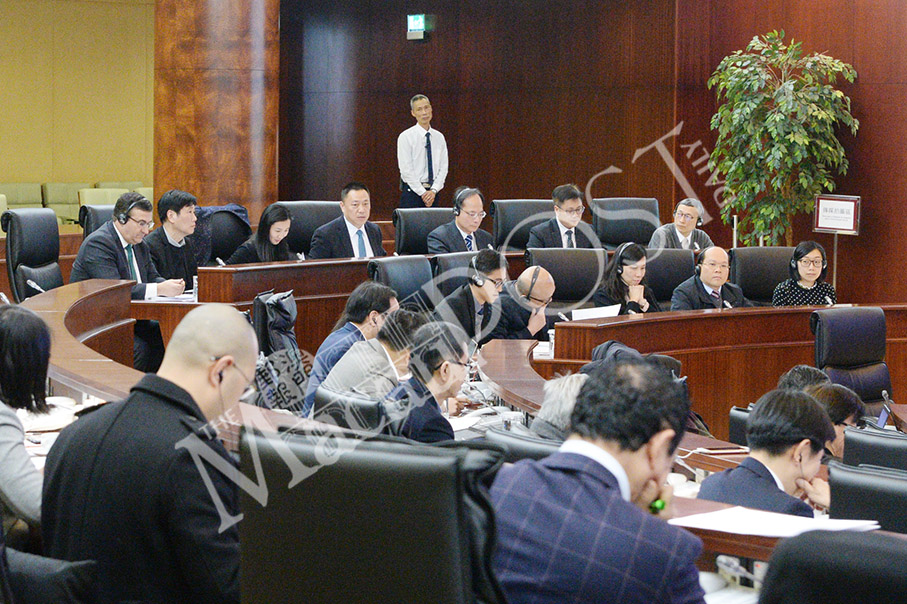 Accompanied by several officials, Secretary for Economy and Finance Lionel Leong Vai Tac (fourth from right in the top row of seats for officials) addresses yesterday’s plenary session in the legislature’s hemicycle. Photo: GCS