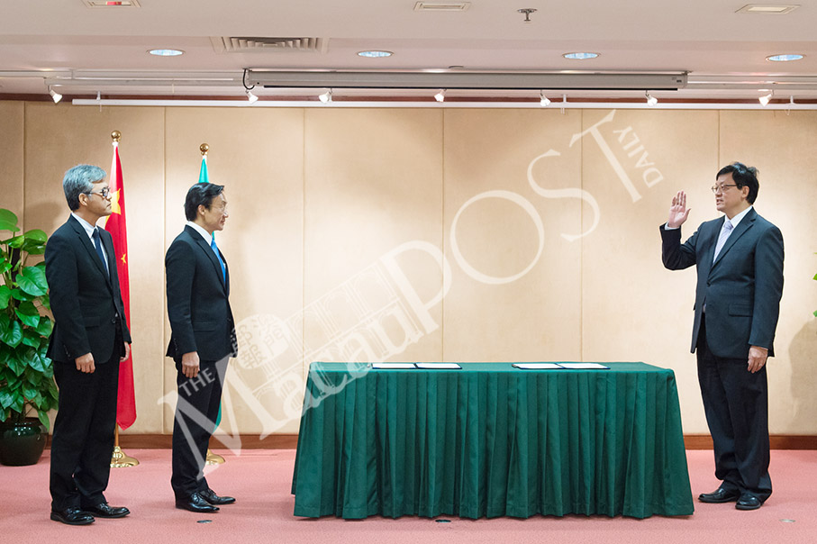 Newly-appointed Education and Youth Affairs Bureau (DSEJ) Director Lou Pak Sang (right) is sworn in yesterday, witnessed by Secretary for Social Affairs and Culture Alexis Tam Chon Weng (centre) and his chief-of-cabinet Ip Peng Kin, at the bureau in Nam Van. Photo: GCS