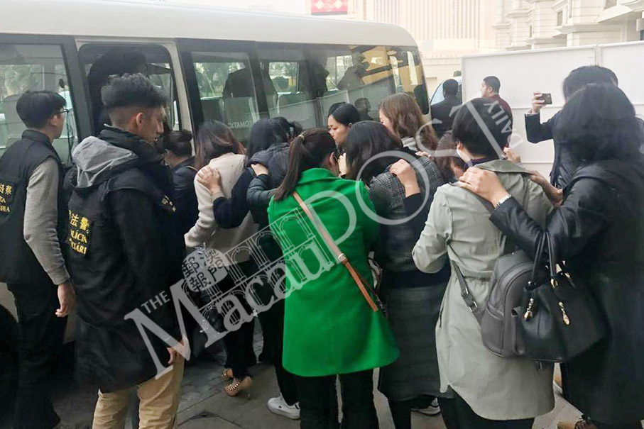 Judiciary Police (PJ) officers escort illegal money changers into a PJ vehicle outside Galaxy Macau in Cotai yesterday. Courtesy TDM
