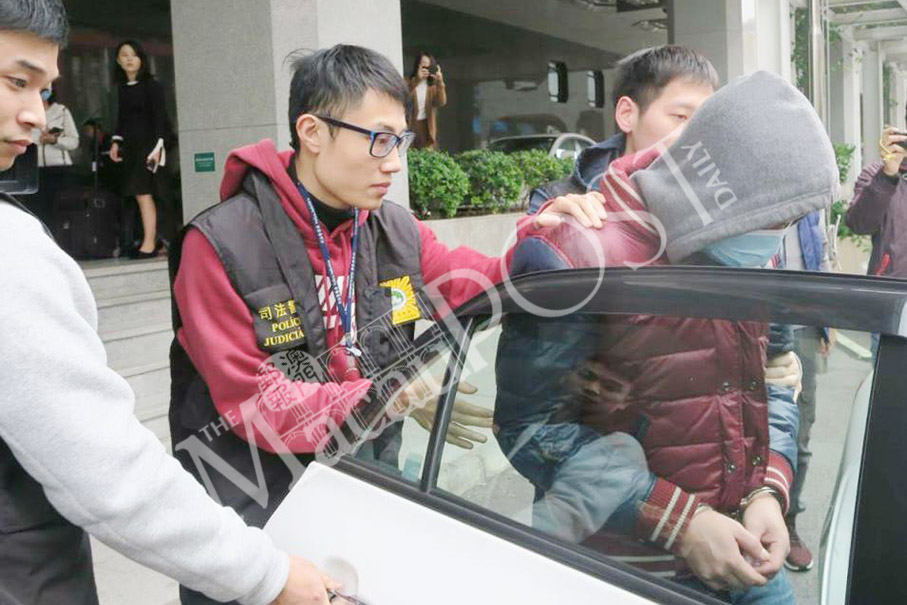 Judiciary Police (PJ) officers escort the hooded Customs Service officer wearing a face mask into a PJ vehicle outside the PJ headquarters in Zape yesterday. Courtesy TDM