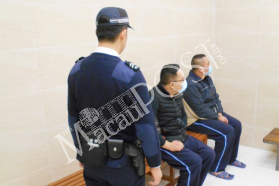 This undated handout photo provided by the Macau Customs Service yesterday shows a customs officer (left) watching over two illegal immigrants awaiting deportation to the mainland.