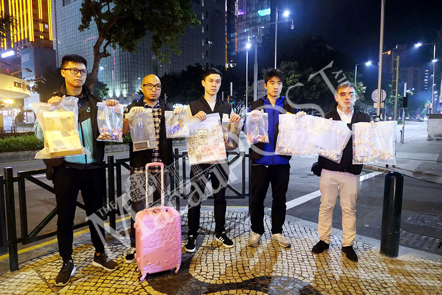Judiciary Police (PJ) officers display items outside Hotel Metropole on Monday night seized from the two drug-smuggling suspects.Photo: Iong Tat Choi