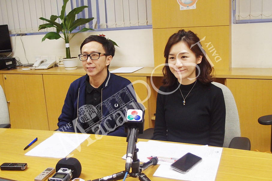 Taipa and Coloane Community Service Consultative Council Deputy Convener Si Nei Na (right) and fellow member Kuok Chiu Fai (left) pose yesterday during a post-meeting press briefing at the Islands District Public Services Centre in Taipa. Photo: Joel Chu