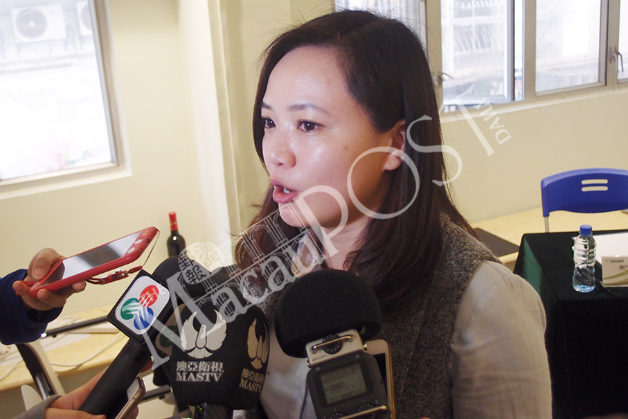 Juliana Ng Chi Neng, vice chairman and secretary general of the Macau Youth Federation, speaks to reporters on the sidelines of the press conference in Calçada do Tronco Velho yesterday. Photo: Joel Chu