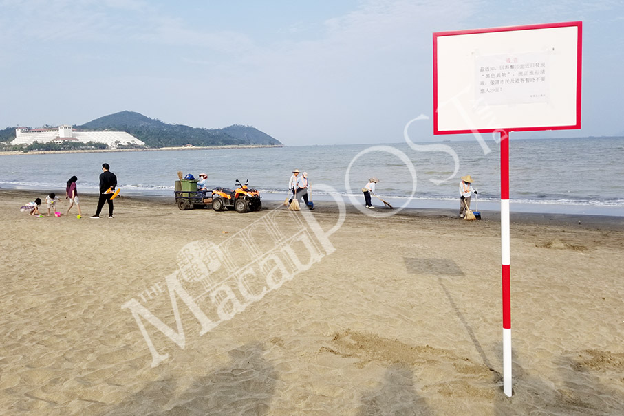 According to a DSAMA statement, the “black substance” arrived with the tide and was spotted on the sand at Hac Sa Beach on Sunday and Cheoc Van Beach yesterday, adding that Macau Waste System Company (CSR) staff were still cleaning up the beaches yesterday. A notice was also put up at the two beaches in Coloane advising beachgoers to stay off the sand.