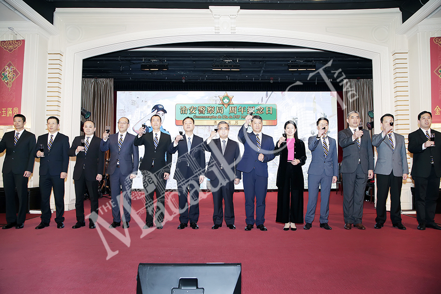 Secretary for Security Wong Sio Chak (centre), Unitary Police Service (SPU) Commissioner-General Ma Io Kun (sixth from left), Public Security Police (PSP) Commissioner Leong Man Cheong (sixth from right), and other senior police personnel offer a toast during yesterday’s dinner marking the 327th anniversary of the establishment of the police force on March 14, 1691, at The Plaza Restaurant in Zape. Photo: GCS
