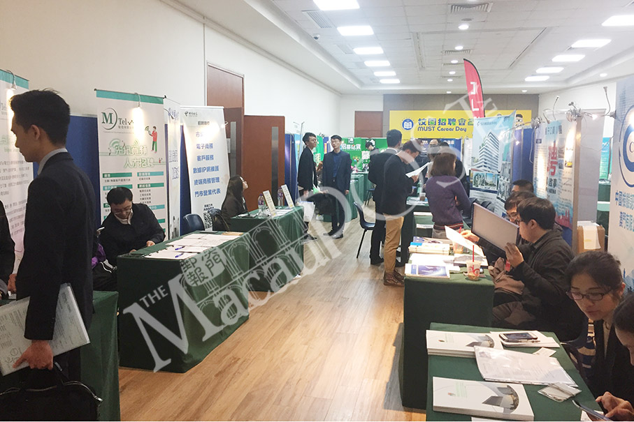Students look at booths during yesterday’s career fair on the campus of the Macau University of Science and Technology (MUST). The two-day event ends today. Photo: Edwin Yang