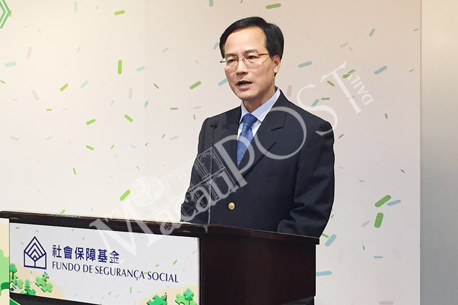 Social Security Fund (FSS) President Iong Kong Io delivers a speech during yesterday’s ceremony marking the participation of seven fund management companies in the city’s non-mandatory central provident fund system, at the Macau Business Support Centre (MBSC) in Nape. Photo: Tony Wong