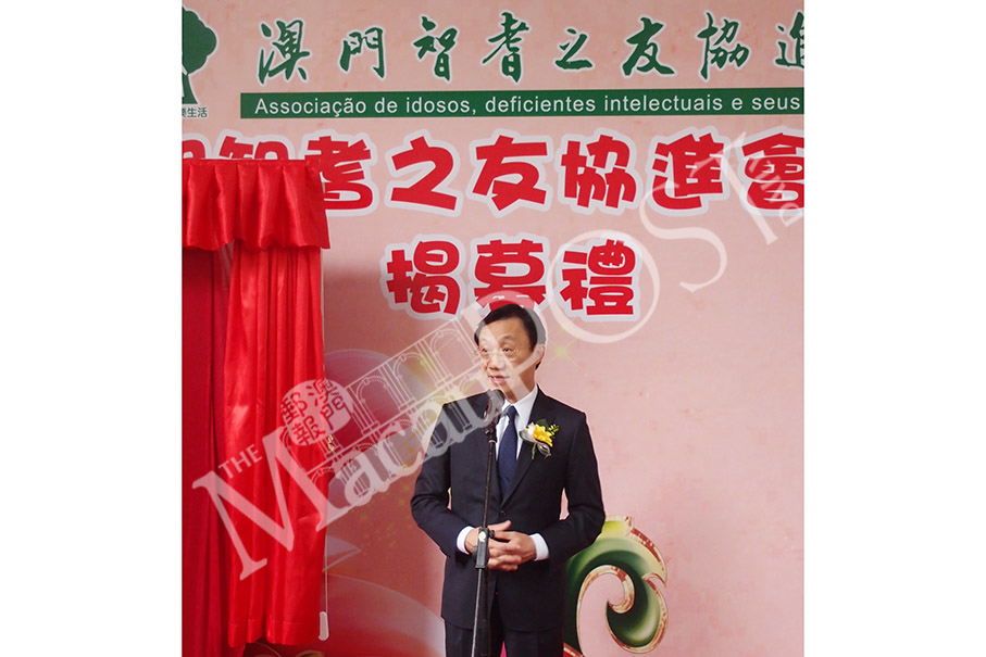 Secretary for Social Affairs and Culture Alexis Tam Chon Weng speaks yesterday at the opening ceremony of the premises of the Association of the Intellectually Disabled and their Elderly Parents, in Areia Preta district. Photo: Joel Chu