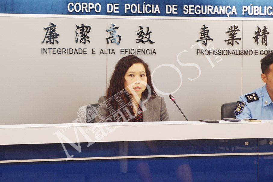 Judiciary Police (PJ) spokeswoman Lei Hon Nei speaks during yesterday’s regular press conference in Zape. Photo: Joel Chu