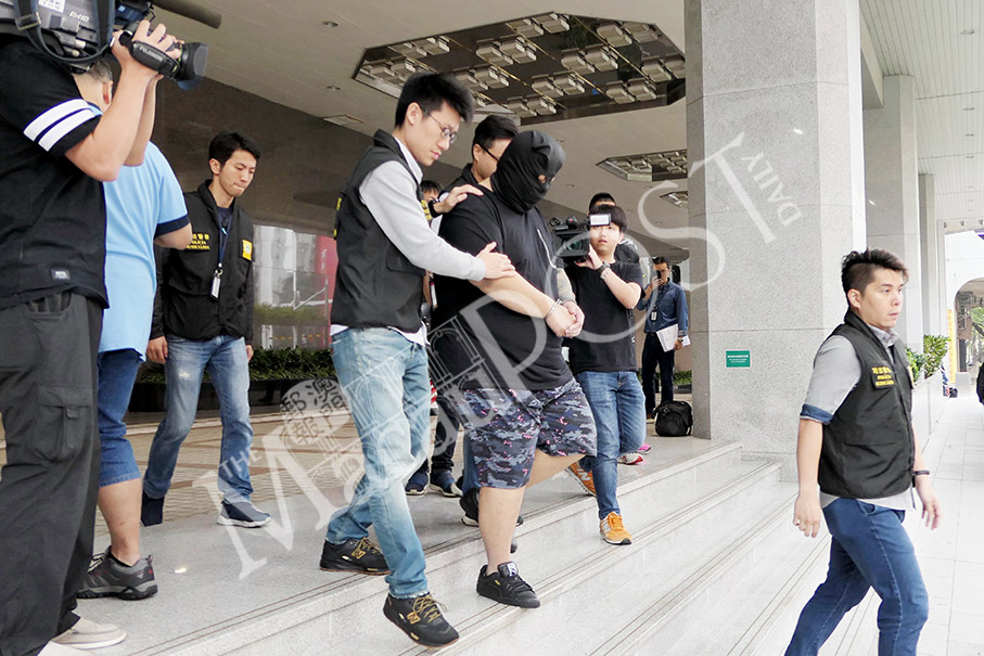 Judiciary Police (PJ) officers escort the hooded robbery suspect to a PJ vehicle outside the PJ headquarters in Zape yesterday. Photo: Iong Tat Choi
