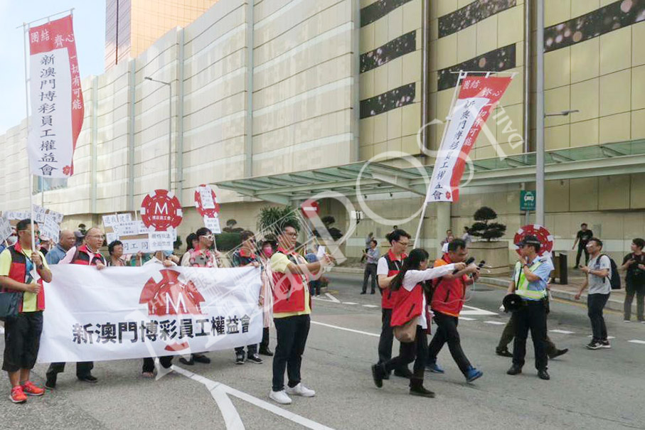 Protestors of the New Macau Gaming Workers’ Rights Union start their march outside MGM in Nape on Tuesday. The banner displays the union’s name in Chinese. Courtesy: TDM