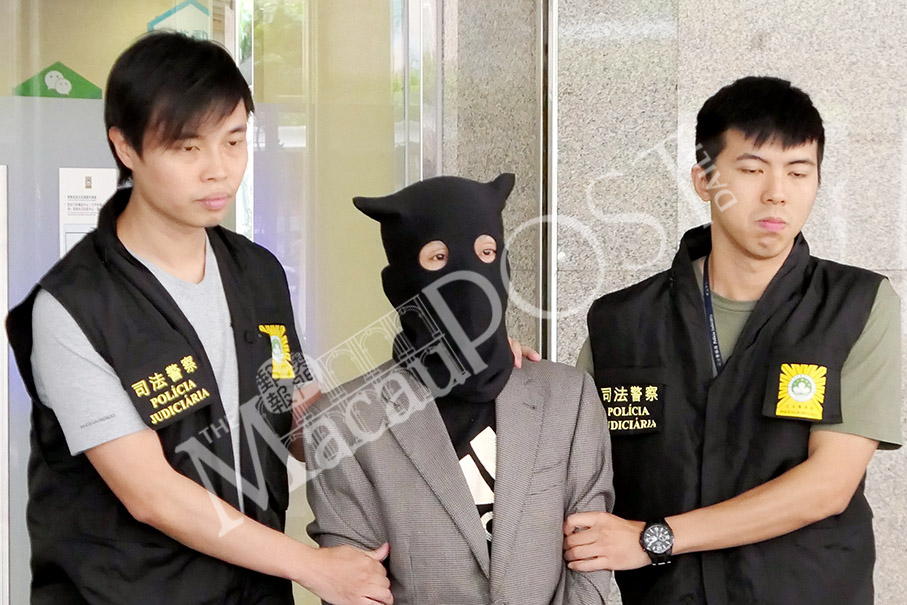 Police officers escort the suspected pickpocket to a police vehicle outside the PJ headquarters in Zape yesterday. Photo: Iong Tat Choi