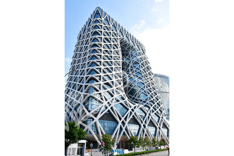 This photo taken yesterday shows the external view of the free-form exoskeleton-bound Morpheus at Melco’s City of Dreams complex in Cotai.